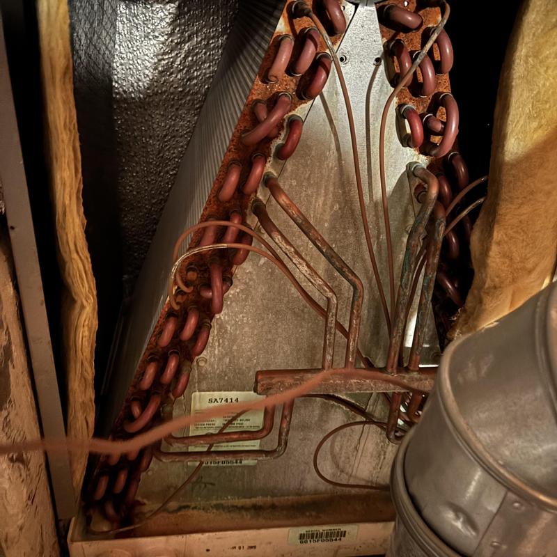 John Davis Heating and Air inspected a Carrier air conditioner and furnace in Peachtree City, GA. Technicians identified a rusted and leaking indoor coil. A customer service representative visited the home to explain available replacement options for the damaged component.