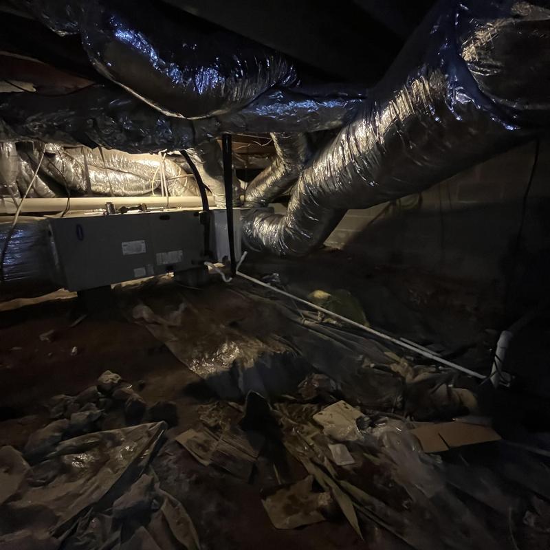 Technicians in Williamson, Georgia, resolved a moisture issue around an Amana HVAC unit in a crawl space. They found insufficient duct insulation and added proper insulation to prevent further moisture accumulation and improve system efficiency.