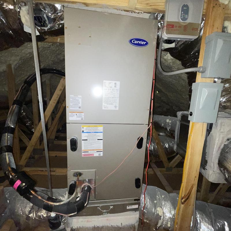 John Davis Heating and Air installed a new Amana 3-ton air handler in Union City, GA. The team added 8kW heat strips, a new return box, and charged the system with 410A refrigerant to complete the installation.
